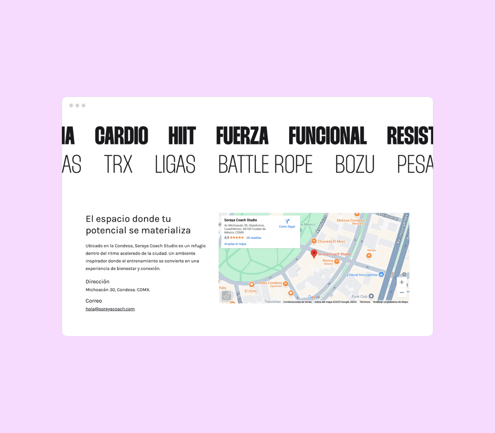 Soraya Coach is a personal trainer based in Mexico City, offering personalized training sessions both in-person and online. Her philosophy emphasizes not just physical fitness but also mental and emotional well-being, aiming to help clients achieve a balanced and healthy lifestyle.